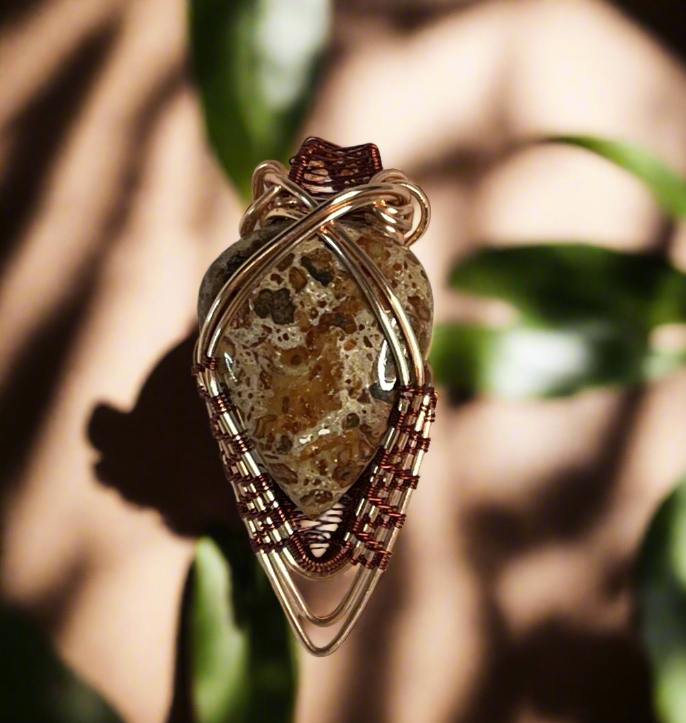 The Rose Gold and Burgundy Wrapped Jasper Pendant is a beautiful accessory crafted with precision and style. With its unique blend of rose gold and burgundy colors, it adds a touch of elegance and sophistication to any outfit. The pendant is carefully wrapped in jasper, adding a natural and earthy element to its design. It is a must-have for any jewelry collection and makes for a stunning addition to any look.