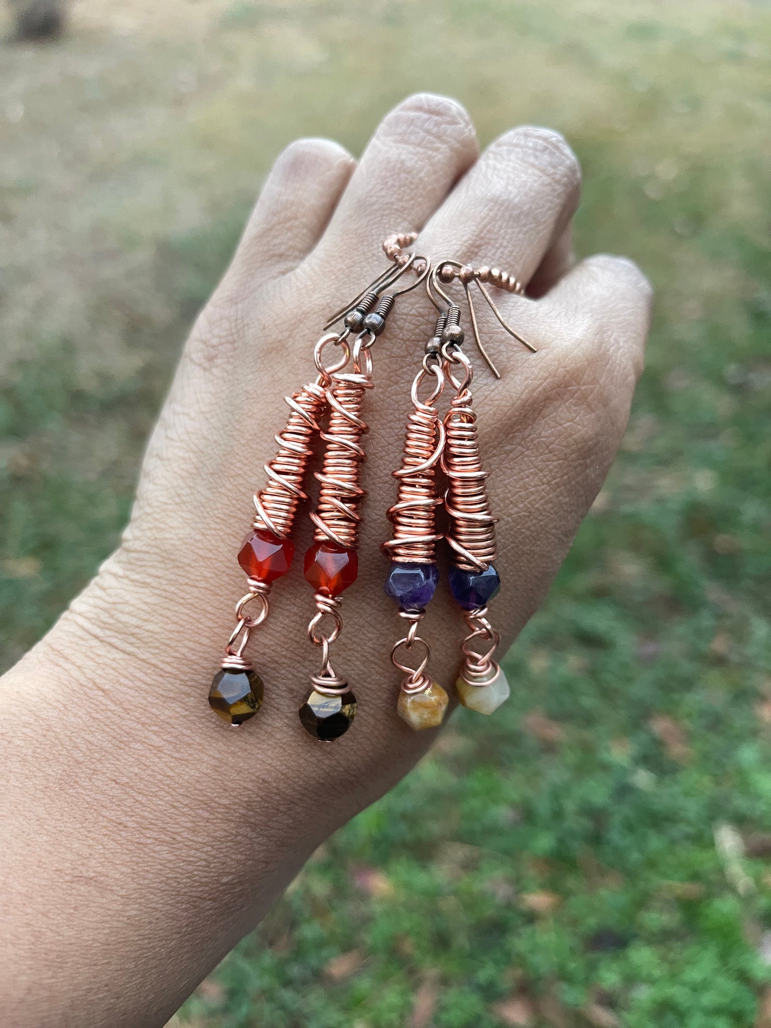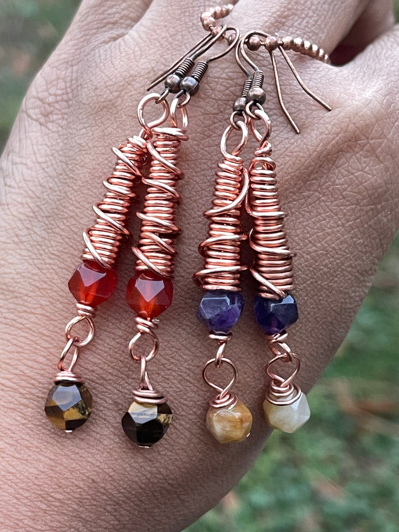 Copper cone spiral earrings with Carnelian with Tiger’s eye and Amethyst with Topaz Jade with surgical steel earring post hypoallergenic